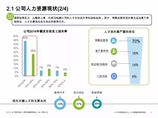 而从整体上看,约有72%的公司的人才主动流失率在20%以内。其中,销售运营流失情况最严重,占70%,客户服务岗排第二,仅占16%。这些关键人才的去向最多的是自主创业,占比达37%,其次为流失到竞争对手,占比为35%。