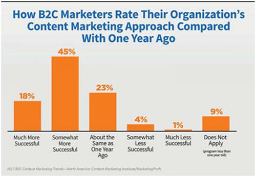 在最近一次调查中,大约63%受访B2BC营销人员称他们机构的内容营销比一年前效果好一点或好很多。
