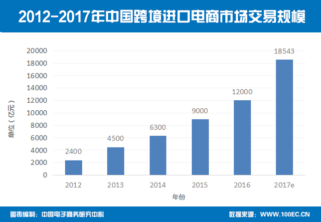 报告显示,2016年,中国跨境进口电商交易规模为12000亿元,这意味着中国跨境进口电商交易规模首度跨入“万亿时代”。对比2015年的9000亿元,同比增长33.3%,预计2017年将达18543亿元。