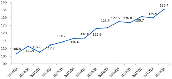 【全国网络零售发展指数,由中国国际电子商务中心与北京易观智库网络科技有限公司联合编制,是全面反映网络零售发展状况的指标体系,包括一个总指数和全国网络零售企业成长指数、全国网络零售渗透指数、全国消费者网络零售参与指数和全国网络零售环境指数4个分指数,以2014年1季度为基期,基期值为100。】
