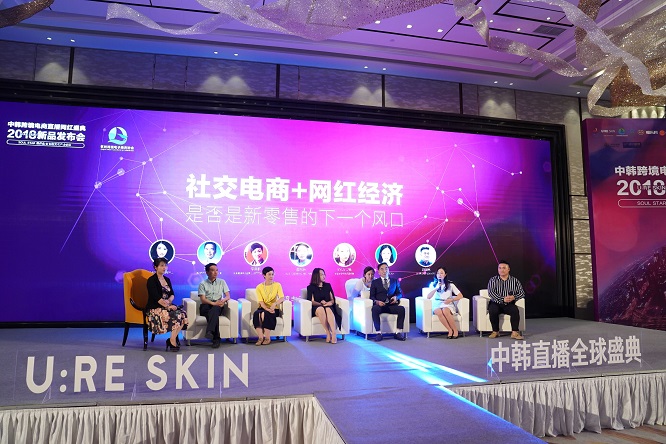 在中韩跨境电商创新论坛上,杭州跨境电商协会秘书长李星慧、杭州市电子商务研究院院长赵浩兴、杭州峰澜科技董事长(Google杭州体验中心)李美群、ECIS(依稀思)代表金株完、美图美妆高级运营经理Sylvie鹤、云集跨境电商负责人笑笑、爱琴嗨购联合创始人/CTO潘国亮就“社交电商+网红经济是否是新零售的下一个风口”话题展开讨论。