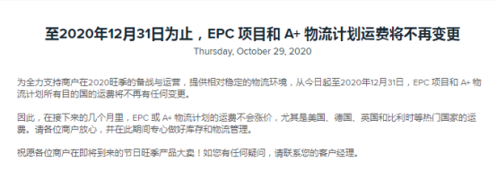 当旺季碰上疫情反扑,物流价格上涨几乎成了必然的结果,但是,Wish卖家们大可不必慌张,10月底,Wish发布公告承诺:A+物流计划、EPC合并订单服务两大直发物流服务,从现在开始到2020年12月31日,将不再更新价格!