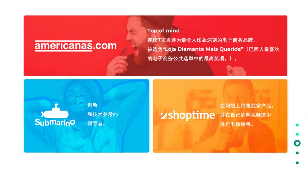 B2W 代表团向协会秘书处介绍其平台及优势。B2W 成立于1999年,是巴西的老牌电商企业,是拉丁美洲电商行业的佼佼者,主要通过数字化平台运营零售业务。17年和18年的成交总额达到150亿雷亚尔。B2W至今一共合并了近十家巴西本土电商网站。其中B2W旗下的Americanas.com、Submarino和Shoptime这3大平台已成为巴西电商行业的标杆,占据了巴西线上零售业50%以上的市场份额。Americanas.com,Submarino和Shoptime消费者拥有不同的定位,客户重叠程度较低,几乎覆盖了所有巴西消费群体。