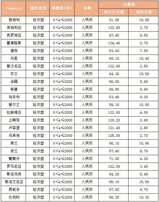 自2020年2月1日起,中国大陆地区发往以下各欧洲路向的SpeedPAK经济型物流管理方案将采取新的收费标准,具体收费标准如下: