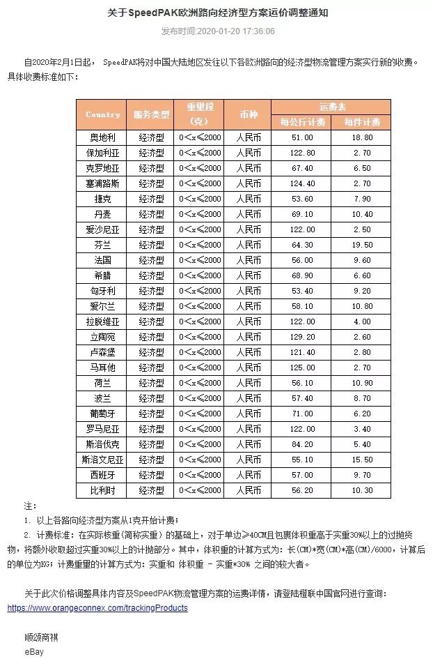eBay于近日发布公告,对SpeedPAK欧洲路向经济型方案运价调整进行通知。