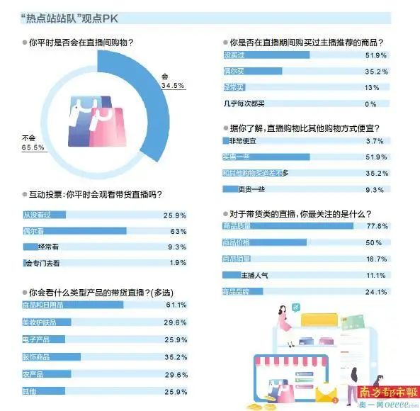 直播购物具有不受空间限制和价格优势,受访者发表相关评论称“食物还可以,衣服不买”,还有认为直播购物“难得这么优惠”。但对于这一新型购物模式,有受访者表示“还没养成购买习惯”、“没有时间看直播卖货”,还有认为“冲动消费可能造成极大浪费”。