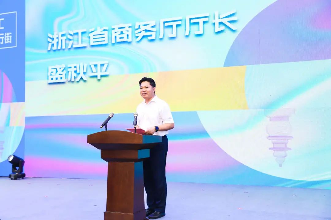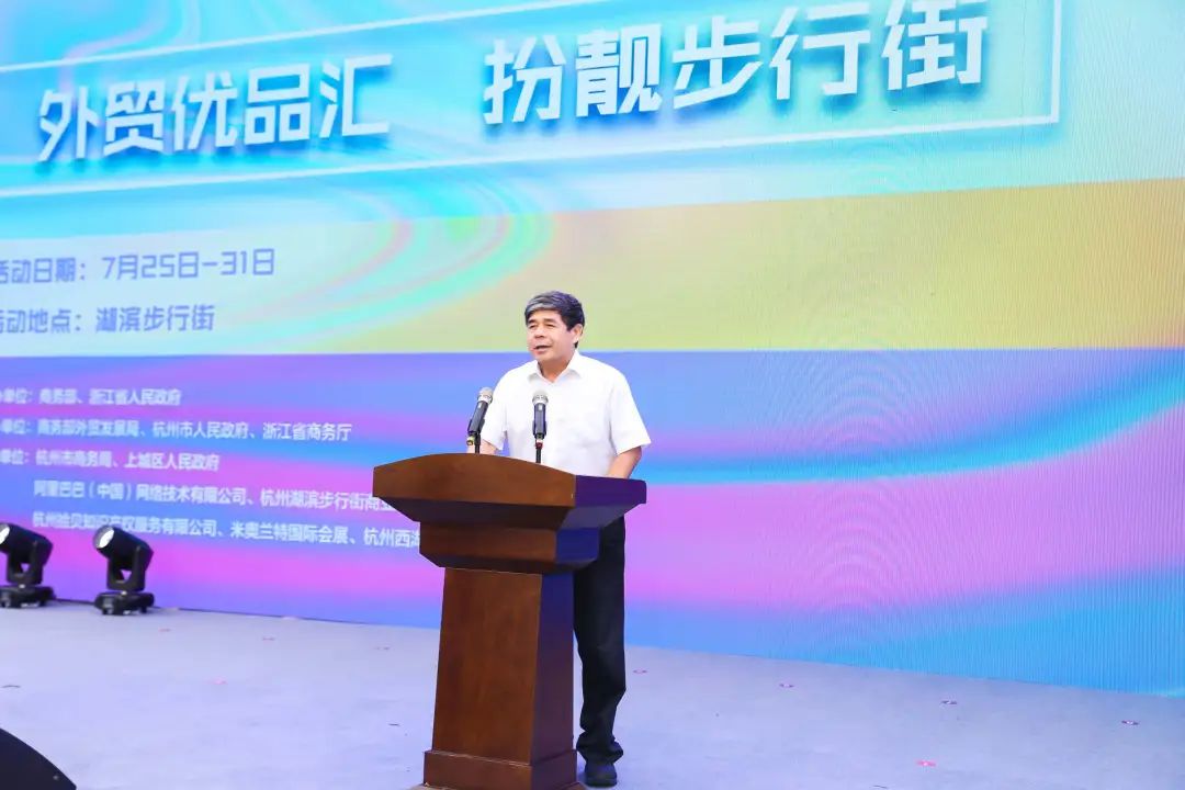 7月25日上午,商务部、浙江省人民政府共同主办的 “外贸优品汇,扮靓步行街”出口产品转内销(杭州站)活动周在杭州湖滨步行街启动。商务部部长助理任鸿斌、浙江省人民政府副省长朱从玖、国家市场监管总局认证监督管理司司长刘卫军出席并致辞。浙江省商务厅厅长盛秋平主持。商务部流通发展司司长郑文、商务部外贸发展局局长吴政平、杭州市人民政府副市长胡伟、中共杭州市上城区委书记陈瑾出席。