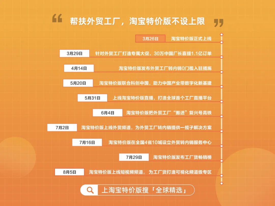 自今年3月26日淘宝特价版上线以来,100天内聚集了全中国145个产业带、120万产业带商家、50万外贸商家、超过30万外贸工厂,外贸工厂集中在淘宝特价版上打开内需新通路,形成“特价版现象”。