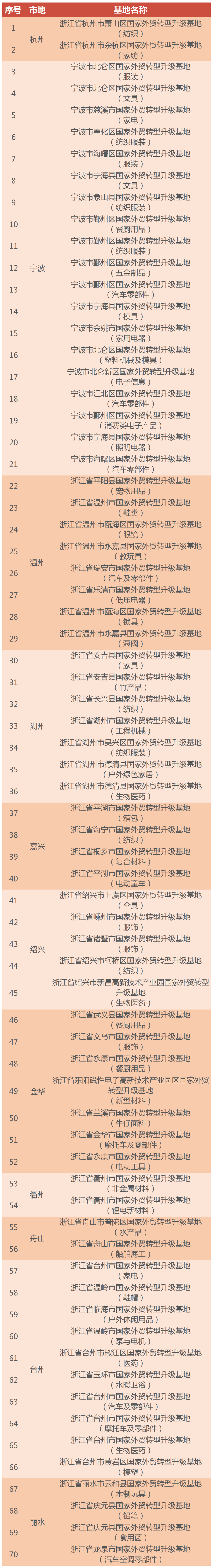 截止目前,浙江省共有国家外贸转型升级基地70家,占全国总数578家的12.1%,居全国首位。
