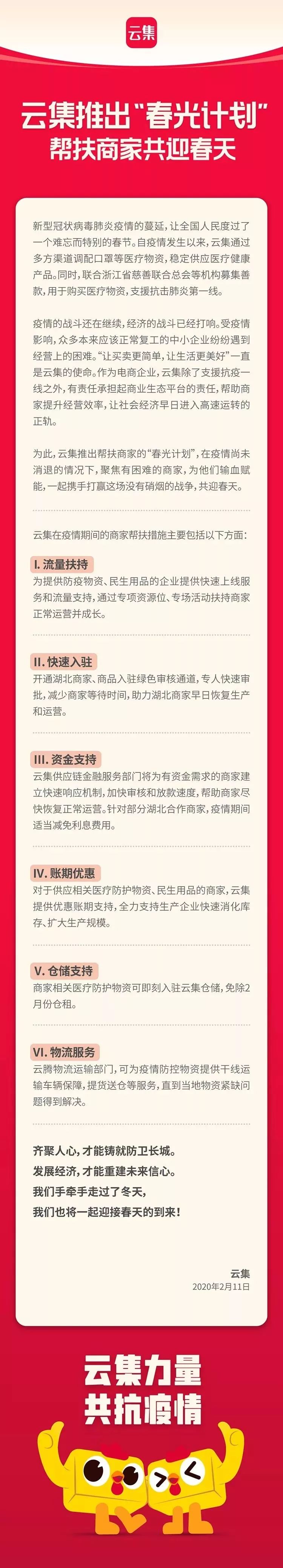 “’让买卖更简单,让生活更美好’一直是云集的使命。作为电商企业,云集有义务承担起商业生态平台的责任,帮助商家提升经营效率,让社会经济早日进入高速运转的正轨。”在“春光计划”中,云集表示。
