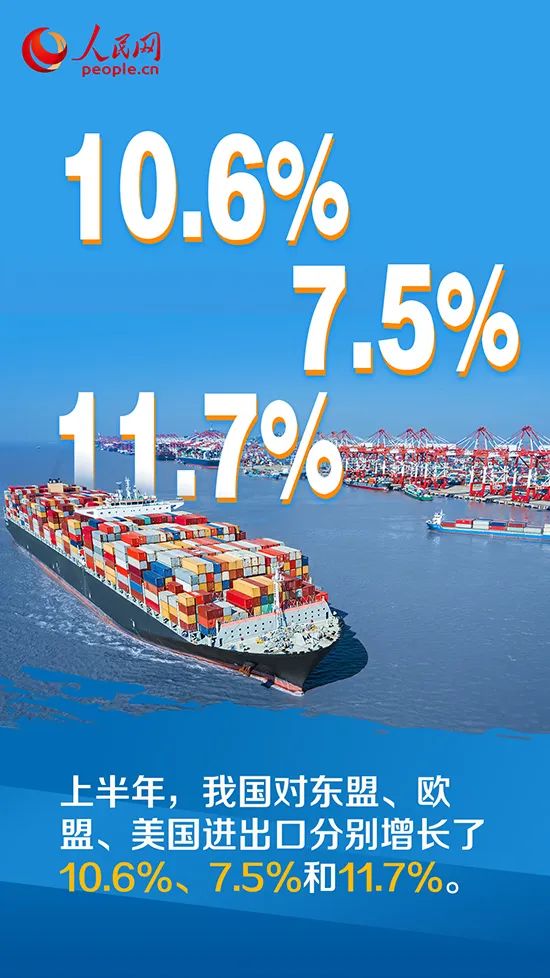 上半年,我国对东盟、欧盟、美国进出口分别增长了10.6%、7.5%和11.7%。同期,我国对“一带一路”沿线国家、区域全面经济伙伴关系协定(RCEP)贸易伙伴进出口分别增长17.8%和5.6%。
