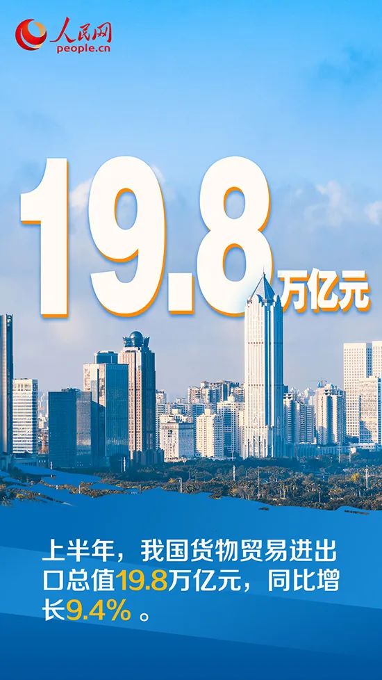 据海关统计,今年上半年我国货物贸易进出口总值19.8万亿元,同比增长9.4%。其中,出口11.14万亿元,增长13.2%;进口8.66万亿元,增长4.8%……上半年外贸进出口“答卷”传递出我国经济持续恢复的积极信号。