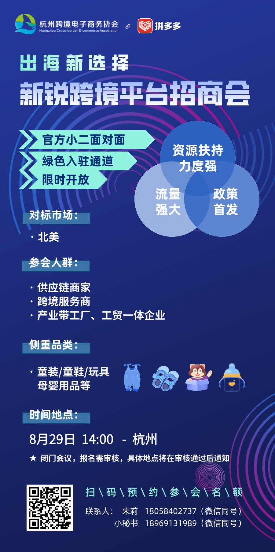 近日,拼多多官方正式公布了其新平台的招商要求。此前,拼多多跨境电商招商团队负责人联系到杭州跨境电商协会,筹办首期拼多多跨境电商招商会,定档8月29日,杭州举行!本期侧重母婴(童装,童鞋,玩具,用品)类目,现场与官方小二面对面,政策首发。