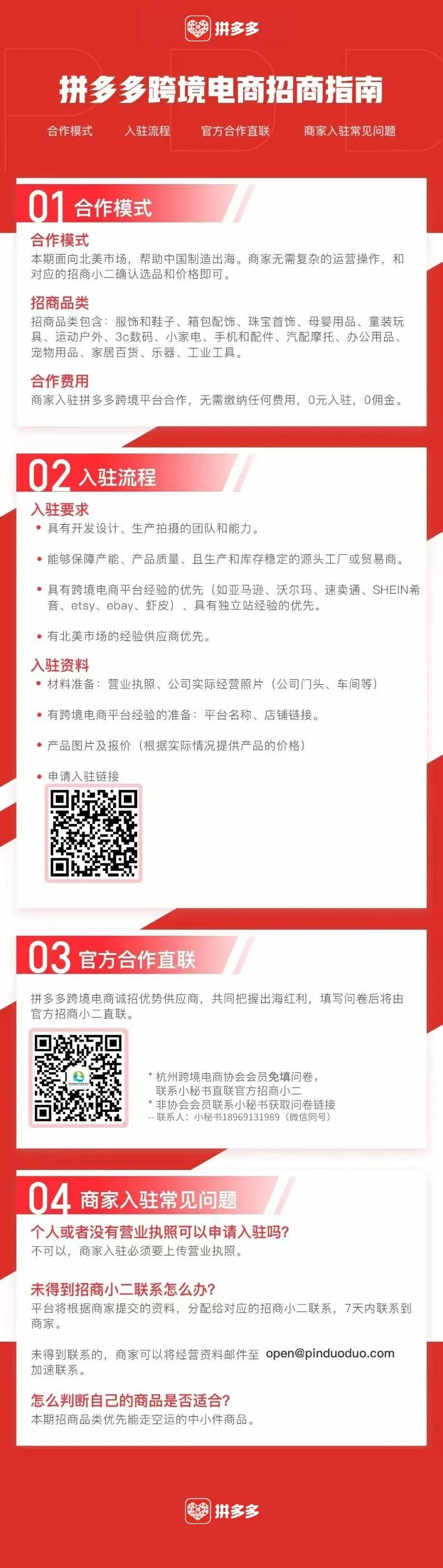 据拼多多跨境平台招商指南显示(附后),本期招商面向北美市场,招募优势供应商加入平台,且商家无需缴纳任何费用,0元入驻,0佣金。对于入驻商家主要有四点要求: