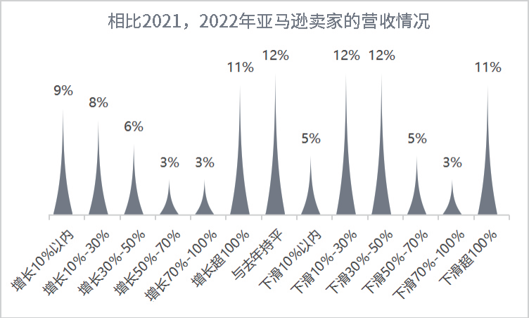 可见,2022年亚马逊卖家两极分化明显,这跟平台的政策变化以及消费环境的变化有关。从亚马逊平台的角度来看,自从封号潮开始之后,一些大卖家账号被关停后,让出了不少市场份额,这些份额被那些排名靠前、有供应链优势和沉淀大量评论的卖家瓜分了。所以,部分卖家的营收增长不错。雨果跨境调研发现,2022年增长率翻倍的卖家占比达到11%。