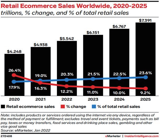 据eMarketer发布的《2022年全球电商市场预测报告》显示,2022年全球电商销售额预计将首次突破5万亿美元,占整体零售总额的 1/5,预计2025年这个数字将突破7万亿美元,电商市场将继续保持增长态势。
