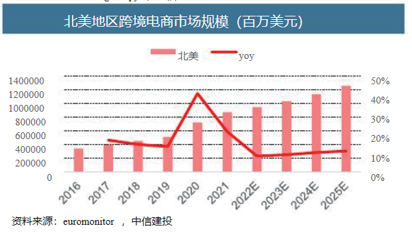 据euromonitor数据显示,北美当前市场规模已达8681亿美元,有望在2年内达到万亿级别。时尚和服装类目成为了北美电商市场发展的主要驱动力。