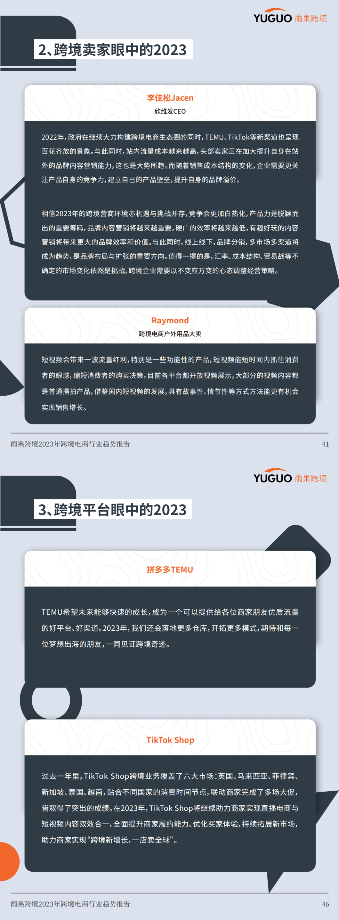 地域冲突爆发、国内疫情反复、海外通胀……2022年,跨境电商行业面临诸多考验。在成本剧增、利润承压之下,卖家加快 多渠道、多平台、多市场布局,TikTok Shop、拼多多TEMU等新流量应时而起,给卖家带来新的增长机遇。同时,在海运费持续下降、新流量红利爆发时,中国品牌加速出海。国内疫情防控措施大调整之后,2023年跨境电商行业又将勾勒出怎样的发展格局?雨果跨境内容中心走访广州、深圳、北京、上海、厦门等地,同时对11000+位行业人士进行了问卷调查,最终形成了一份涵盖跨境电商市场变化、行业现状以及未来趋势预判的行业报告。