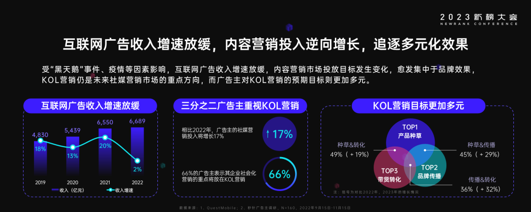 受“黑天鹅”事件疫情等因素影响,2022年互联网广告收入增速放缓,收入增速由上一年的20%下降至2%。然而调研数据显示,广告主对于社媒营销的信心仍在,相比2022年,广告主的社媒营销投入将增长17%,其中,三分之二的广告主尤为重视KOL营销。但同时也对KOL营销提出了更高的要求,如对比2022年,2023年“既想要传播又想要转化”的广告主增长了32个百分点,广告主们对KOL营销的预期目标更加多元。