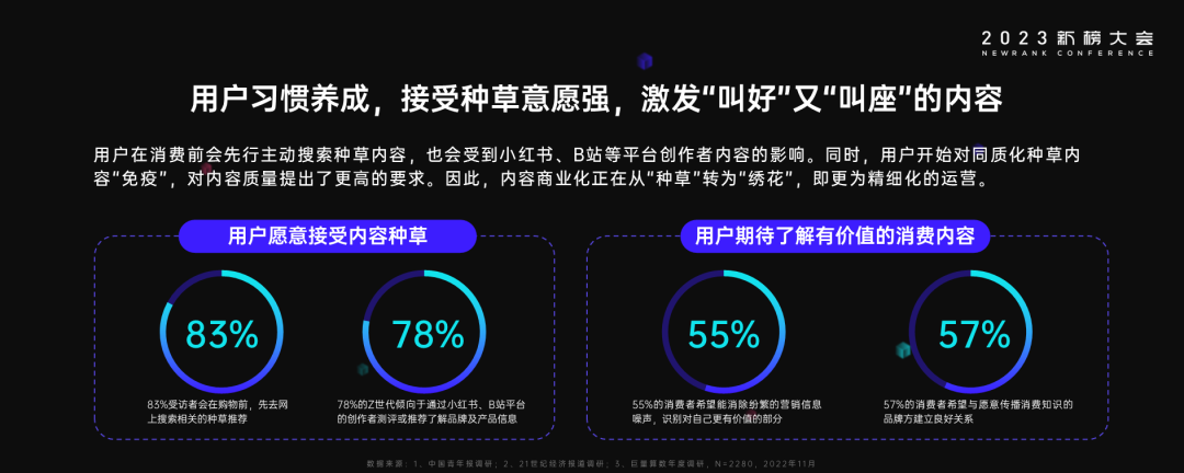 观察内容终端可以发现,多数用户已经养成种草习惯,用户在消费前会先行主动搜索种草内容,拥有较强的种草意愿,但同时用户开始对同质化种草内容“免疫”,对内容质量提出了更高的要求。因此,新榜认为,2023年的品牌应该从“种草”转为“绣花”,即更为精细化的运营,以匹配用户日益提升的优质内容需求。