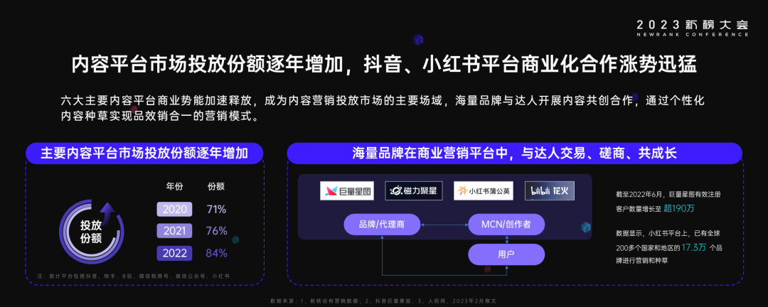 观察投放渠道发现,营销投放交易逐渐向头部内容平台集中,抖音、快手、B站、视频号、微信公众号、小红书等六大平台成为品牌投放市场的主要场域。新榜营销数据显示,六大主要的内容平台投放份额于2022年增至84%。