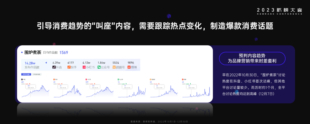 企业要想引导消费趋势的“叫座”内容,需要跟踪热点变化,制造爆款消费话题。新榜发现,通过预判内容趋势,品牌营销是可以实现时差套利的。以去年冬天的“流量明星”——围炉煮茶为例,早在2022年10月30日,“围炉煮茶”讨论热度在抖音、小红书首次达峰,但其他平台讨论量较少。而历时约1个月,全平台讨论热度均达到高峰(12月7日),这意味着,如果品牌获知该内容趋势,可以提前一个月进行套利。