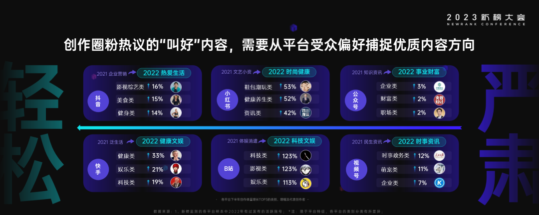 企业要想创作圈粉热议的“叫好”内容,需要从平台受众偏好捕捉优质内容方向。从各平台创作体量增长较快的垂类可以看出,平台间的内容趋势不尽相同,抖音、快手偏向轻松泛生活内容的生长,而公众号、视频号平台则趋向偏严肃的泛资讯类内容,需要企业品牌采用不同的营销策略。