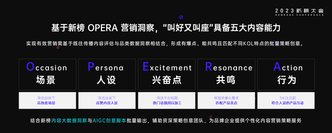 新榜基于优质营销洞察,梳理出了OPERA内容策略方法论,即“叫好又叫座”内容应该具备的五大能力,分别是场景、人设、兴奋点、共鸣以及行为。