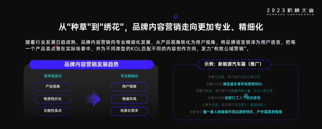 随着内容营销行业的成熟化发展和用户需求的提升,品牌营销需要更为专业、精细化的发展,从简单粗放式的“铺草”向专业精细化的“绣花”发展。以新能源汽车产品为例,品牌宣传“车速”,不能只写“百公里/小时”的行业名词,需要落到具体的生活场景需求中,比如它能“满足返乡青年似箭的归心”。