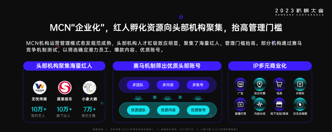 先说内容创作组织,随着MCN机构运营管理模式愈发的规范成熟,头部机构人才虹吸效应明显,聚集了海量红人。行业有这么一句话,“抖音网红千千万,无忧传媒占一半”,无忧传媒《2022年度社会责任报告》显示,签约艺人超过10万。数量庞大的签约艺人规模,大大抬高了MCN的管理门槛。为提高运营效率,部分机构选择赛马竞争机制跑测,以筛选确定潜力员工、爆款内容、优质账号,并围绕头部IP进行多元商业化。