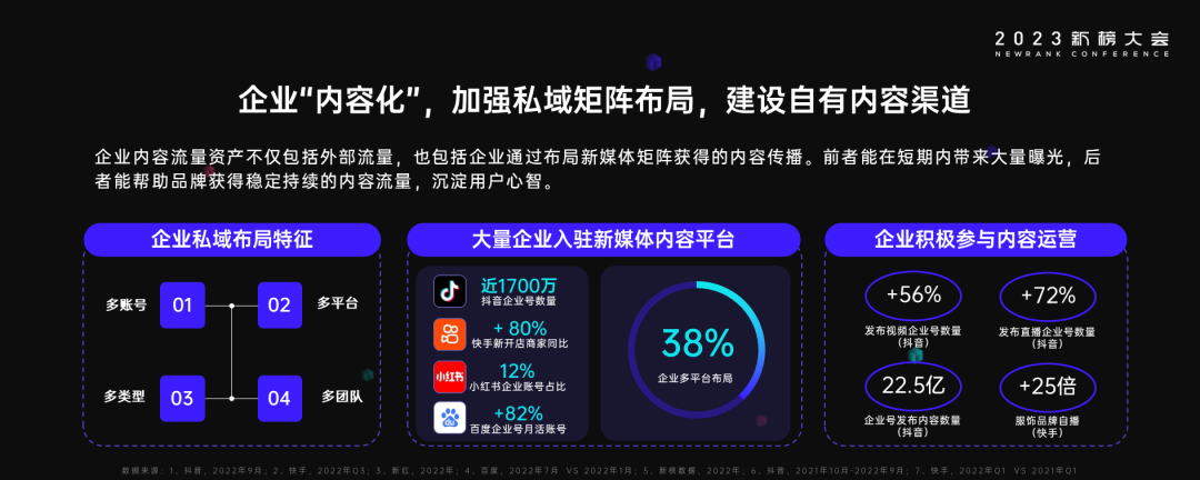 进一步关注新媒体内容平台的企业账号会发现,这些企业不是单纯入驻新媒体内容平台,也在更加积极的参与内容运营。以抖音为例,2022年9月有发布视频行为的企业号用户数较去年同期增长56%,有过直播行为的企业号用户同比增长了72%,2021年10月至2022年9月这一年间,抖音企业号商家共发布内容22.5亿条。