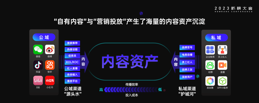 企业在互联网上经营的所有信息,包括私域的“自有内容”与公域的“营销投放”,它们共同产生了海量的数字化内容资产,这些内容资产具有“海量”、“分散”的特性。