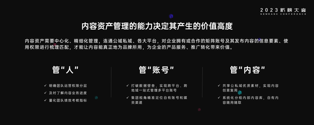 因此,内容资产需要中心化、精细化管理,连通公域私域、各大平台,对企业拥有或合作的矩阵账号及其发布内容的信息要素、使用权限进行梳理匹配,才能让内容能真正地为品牌所用,为企业的产品服务、推广转化带来价值。