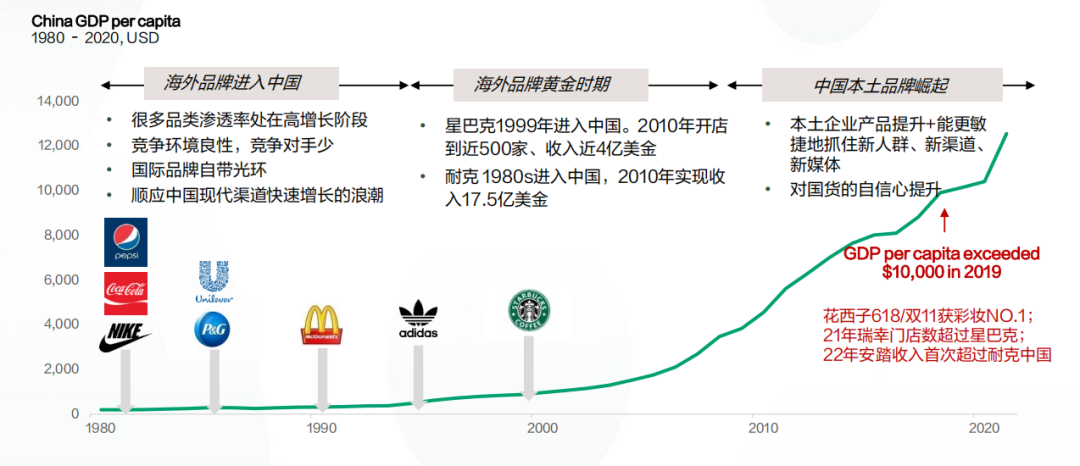 海外品牌自1980s进入中国后,曾经历过高速发展的黄金时期,但近几年中国本土品牌在产品、 渠道、营销方式上更灵敏地把握住了变化,本土品牌在很多行业纷纷崛起,超过海外品牌。