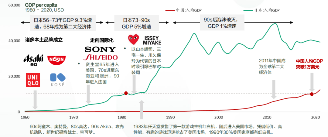 日本头部企业集中在战后-70s成立并高速发展,在80s人均GDP超过1万美金后地位逐渐稳固, 并加快了全球化步伐;在这个过程中日本的动漫、游戏、时尚也走出了特色并在全球崭露头角, 是文化+产品相辅相成的崛起。中国近几年也到了本土品牌加速发展的阶段。