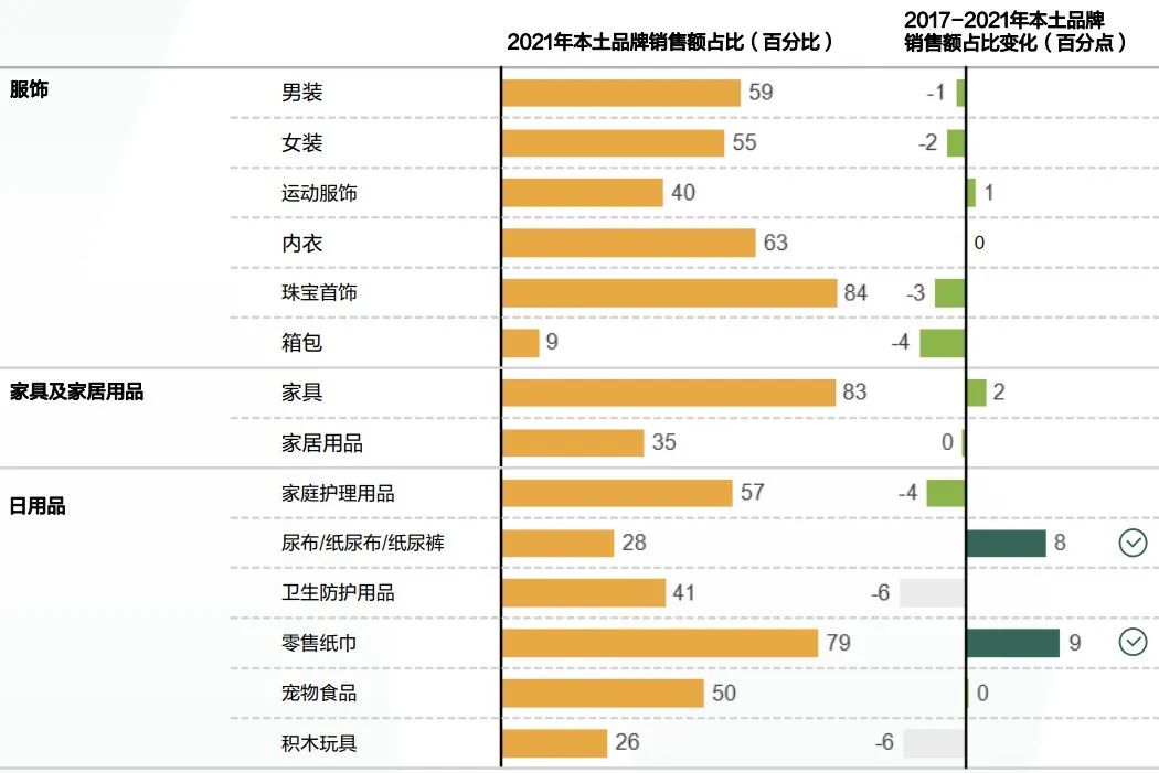 • 品牌市场份额动态:2)在过去5年中,本土品牌在15个品类中的份额显著增加(5%+),仅有2个品类份额出现大幅下降(<-5%)。