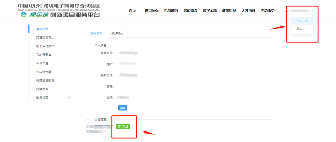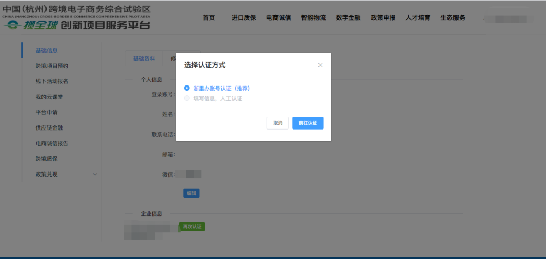打开个人中心,在企业信息中前往认证。(用于申报的账号需要经过浙里办企业法人认证,已认证的朋友可直接进行申报)
