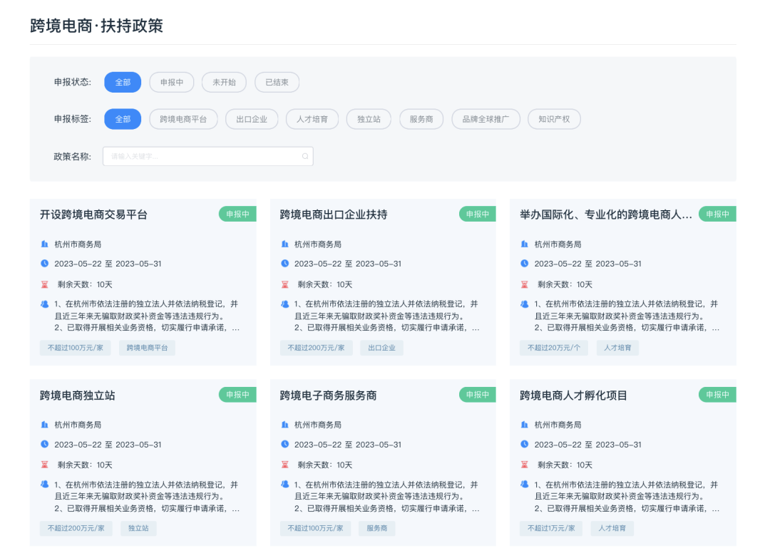 自2023年5月22日起,在杭跨境电商企业即可登录eBox创新项目服务平台的政策申报模块,进行一站式线上政策申报。