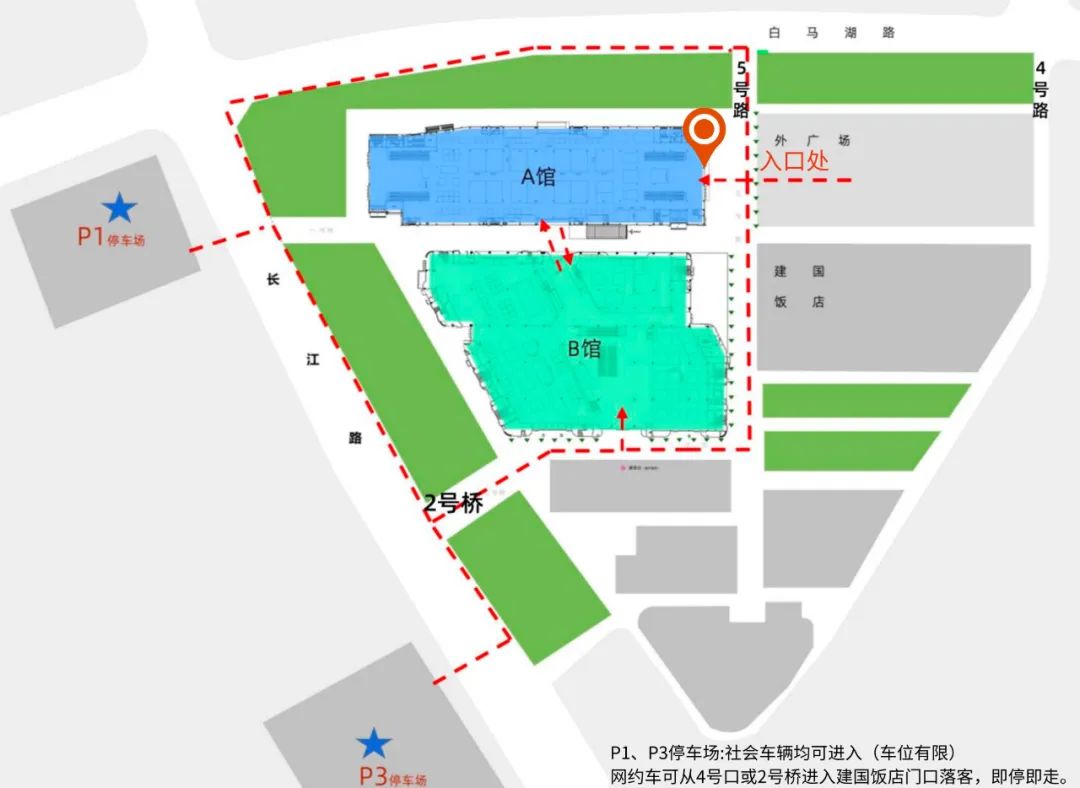 2、网约车可从4号口或2号桥进入建国饭店门口落客,即停即走。