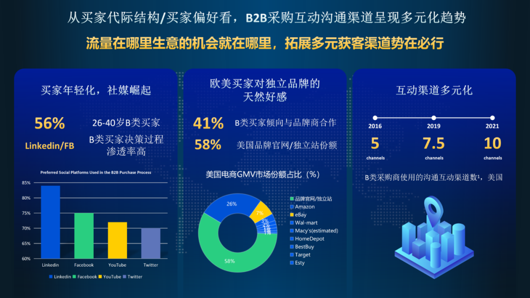 数据显示,B2B线上交易年增长率22%,三分之二的B2B买家都采用线上采购。作为全球最大的B2B跨境电商平台,阿里巴巴国际站买家已覆盖全球200多个国家地区。