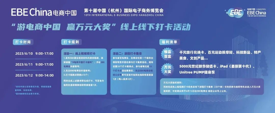 6月10日,EBE China电商中国·第十届中国(杭州)国际电子商务博览会(以下简称电博会)在杭州白马湖国际会展中心开展。本届电博会由杭州市人民政府、浙江省商务厅主办,杭州市商务局、滨江区人民政府承办,杭州会展集团∙西博文化运营。