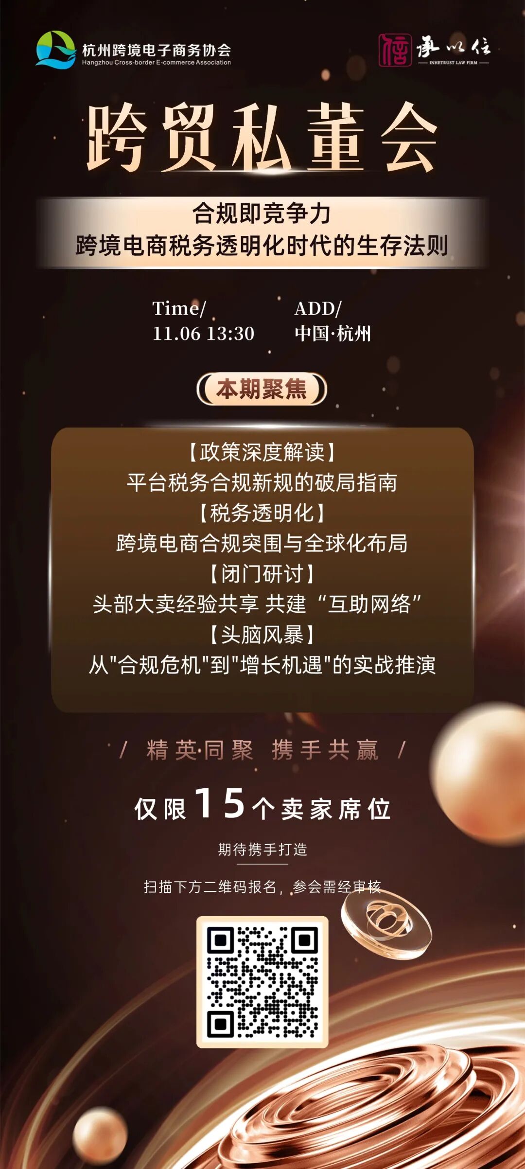 点击上方蓝字,记得关注我们!▷ 仅限 15 家企业・免费参与・席位有限・聚焦跨境电商税务合规▷ 硬核价值📜 平台税务新规 “逐条拆解”,合规不再踩坑🌍 全球化布局 “避坑指南”,从风险到机遇的转身▷ 立即锁定 扫码审核,抢最后入场券!🚨扫描下方海报二维码参与👇编辑:应豪微审核:王园推荐阅读参展报名 | 杭州国际跨境电商博览会:聚合全球资源,领跑跨境电商新赛道,跨境人必冲!参展报名 | 跨境人必看!2025杭州国际跨境电商博览会来袭,源头工厂+全产业链资源都在这关注“杭州跨境电商”回复关键词“入会”获得【入会指南】在看你就赞赞我!
