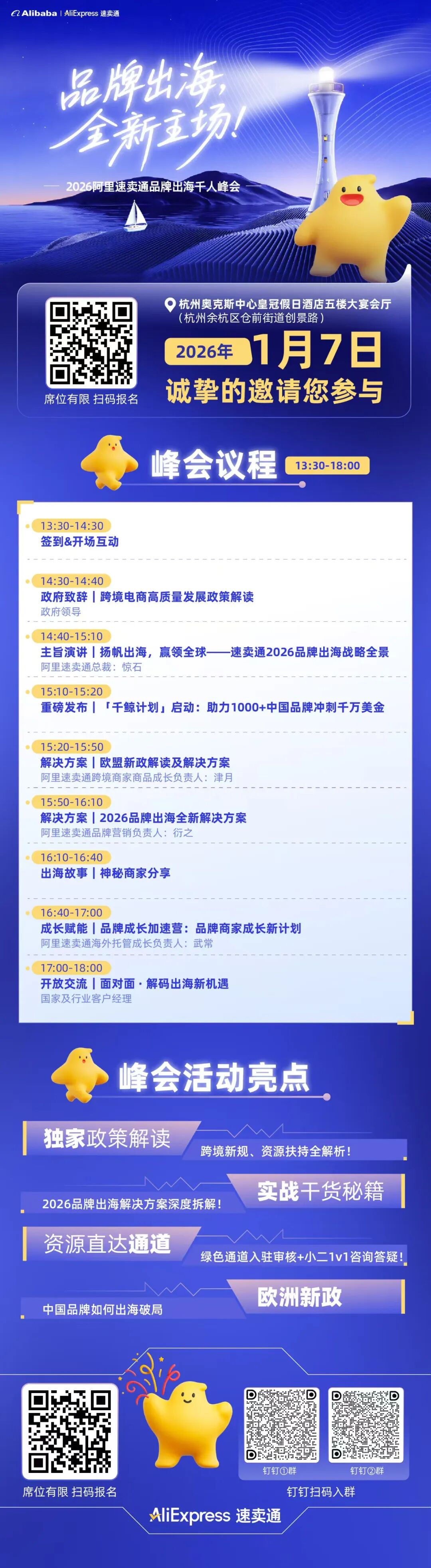 1 月 7 日,2026 阿里速卖通品牌出海千人峰会 落地杭州!政府政策解读、速卖通战略全景、欧洲新政方案、神秘卖家实战分享…… 从方向到方法,一站式帮你搞定品牌出海!