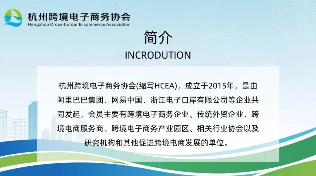 The Hangzhou Cross-Border E-Commerce Association (abbreviated as HCEA) is a non-profit social organization jointly initiated by Alibaba (China) Co., Ltd., NetEase (Hangzhou) Network Co., Ltd., Zhejiang Electronic Port Co., Ltd., and other companies. It is supervised and guided by the Hangzhou Municipal Bureau of Commerce and the Hangzhou Civil Affairs Bureau. The members mainly include cross-border e-commerce enterprises, traditional foreign trade enterprises, cross-border e-commerce service providers, cross-border e-commerce parks, related industry associations, research institutions, and other organizations that promote the development of cross-border e-commerce.